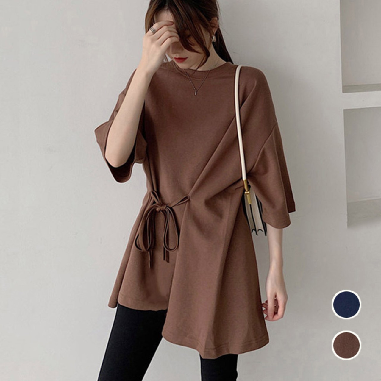一枚でワンピースやチュニック風にシンプルに着こなせる半袖ロング丈Tシャツ