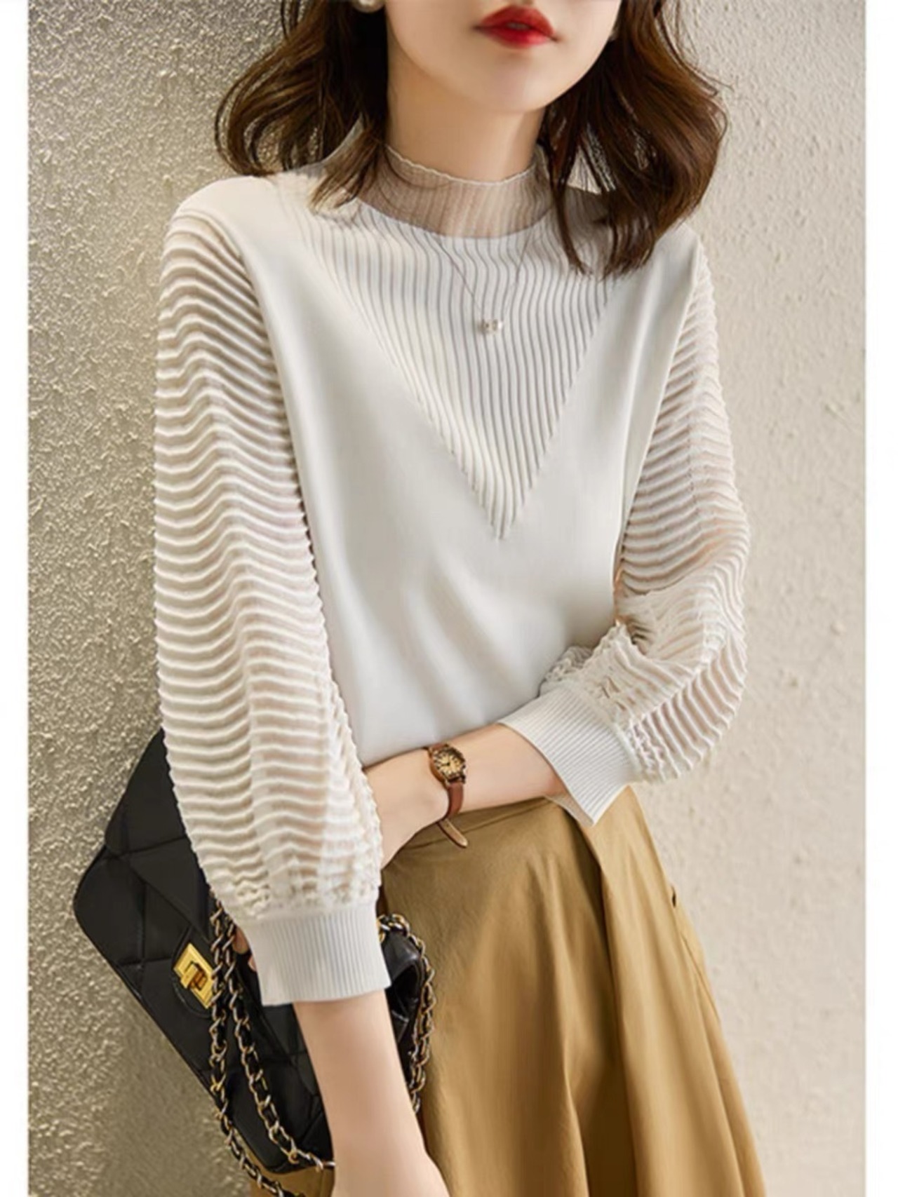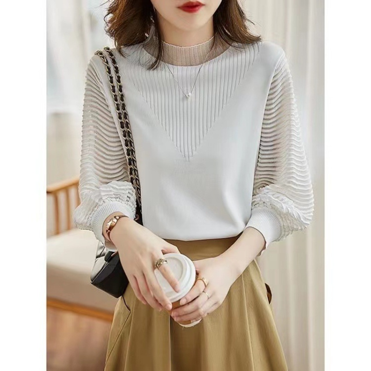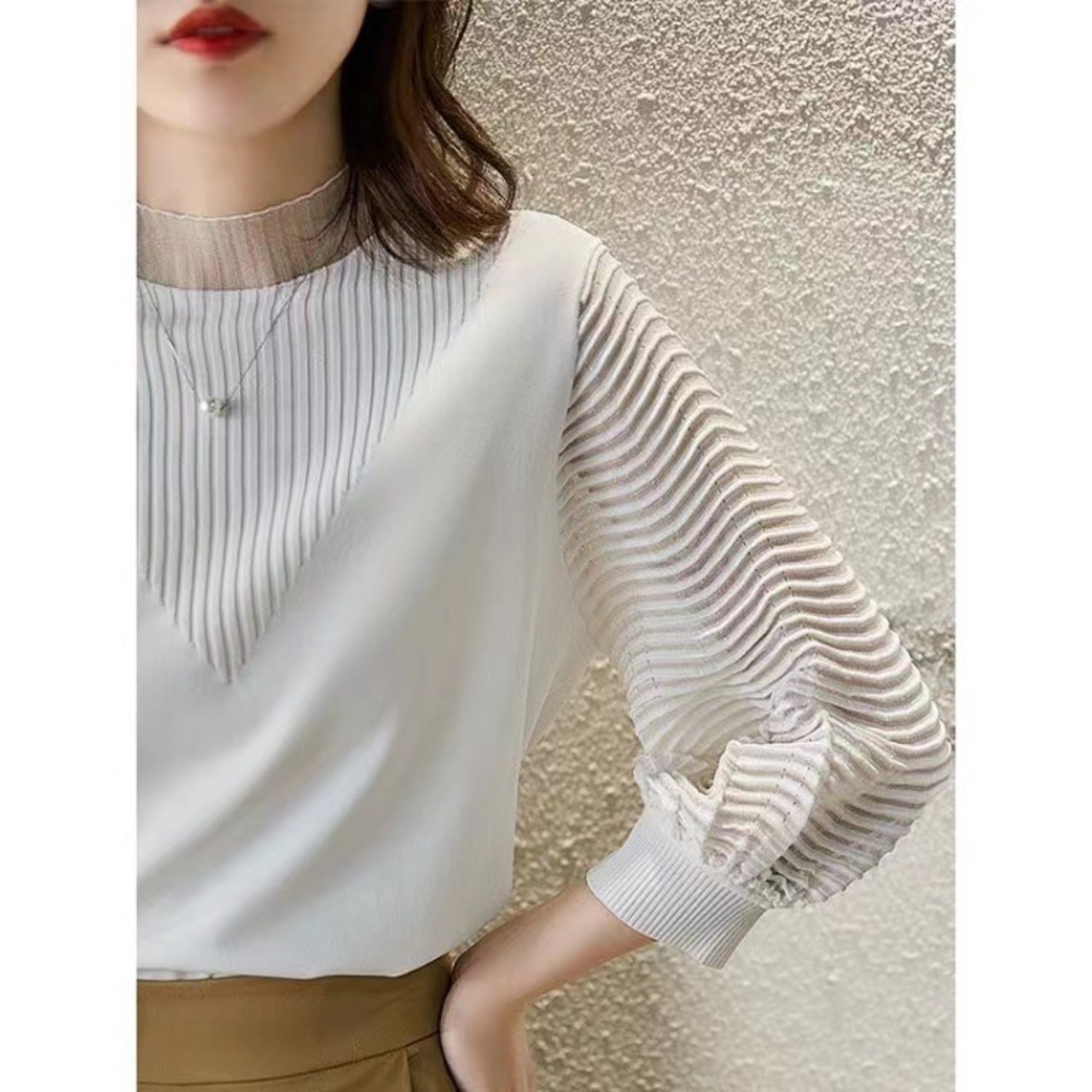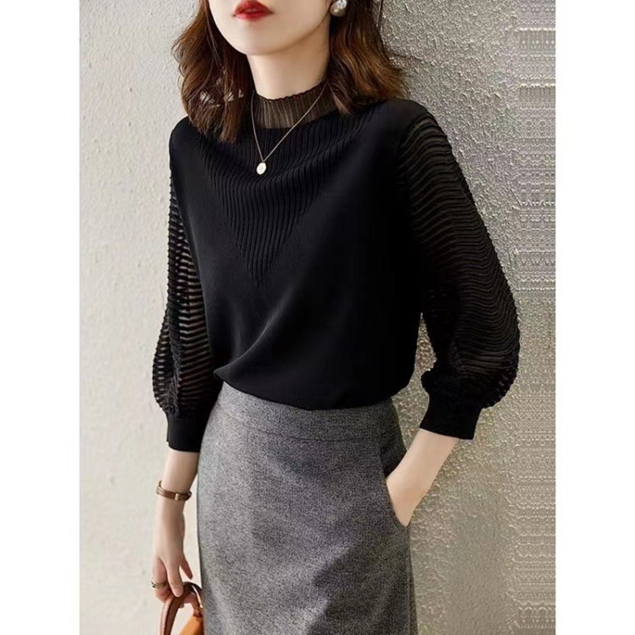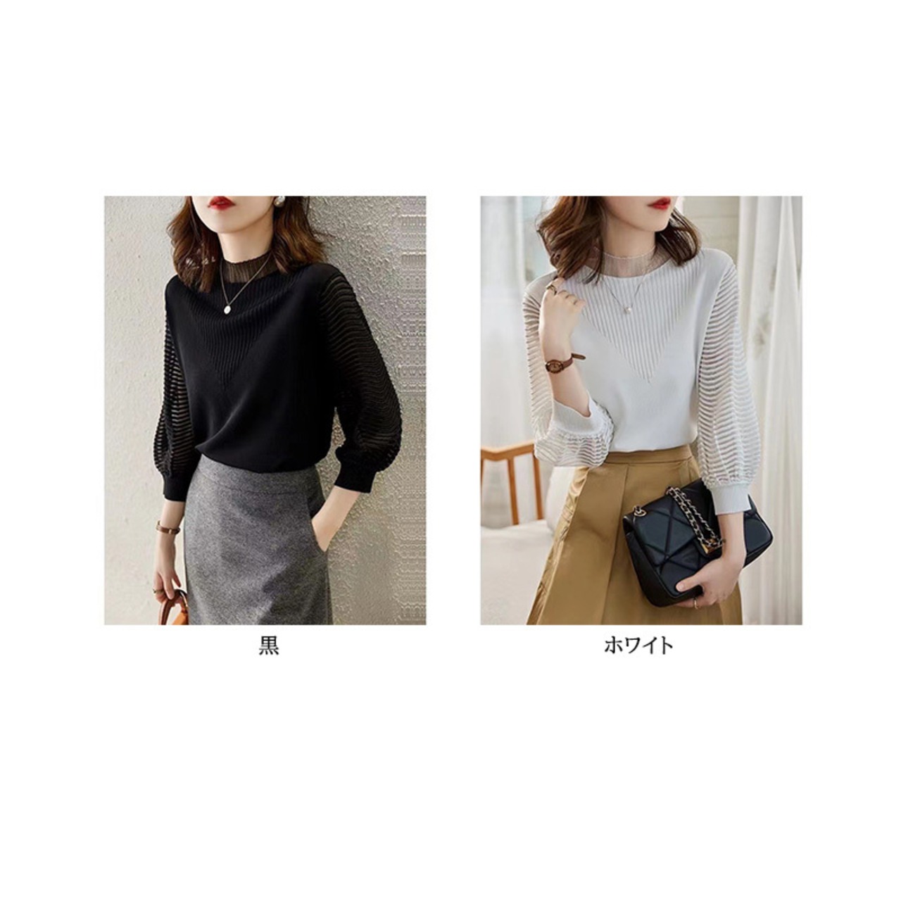 ・袖と首元を透け感のある素材に切り替えたニットトップス。