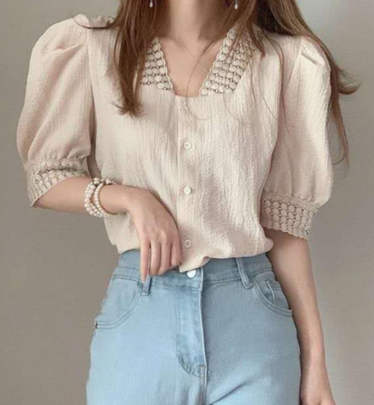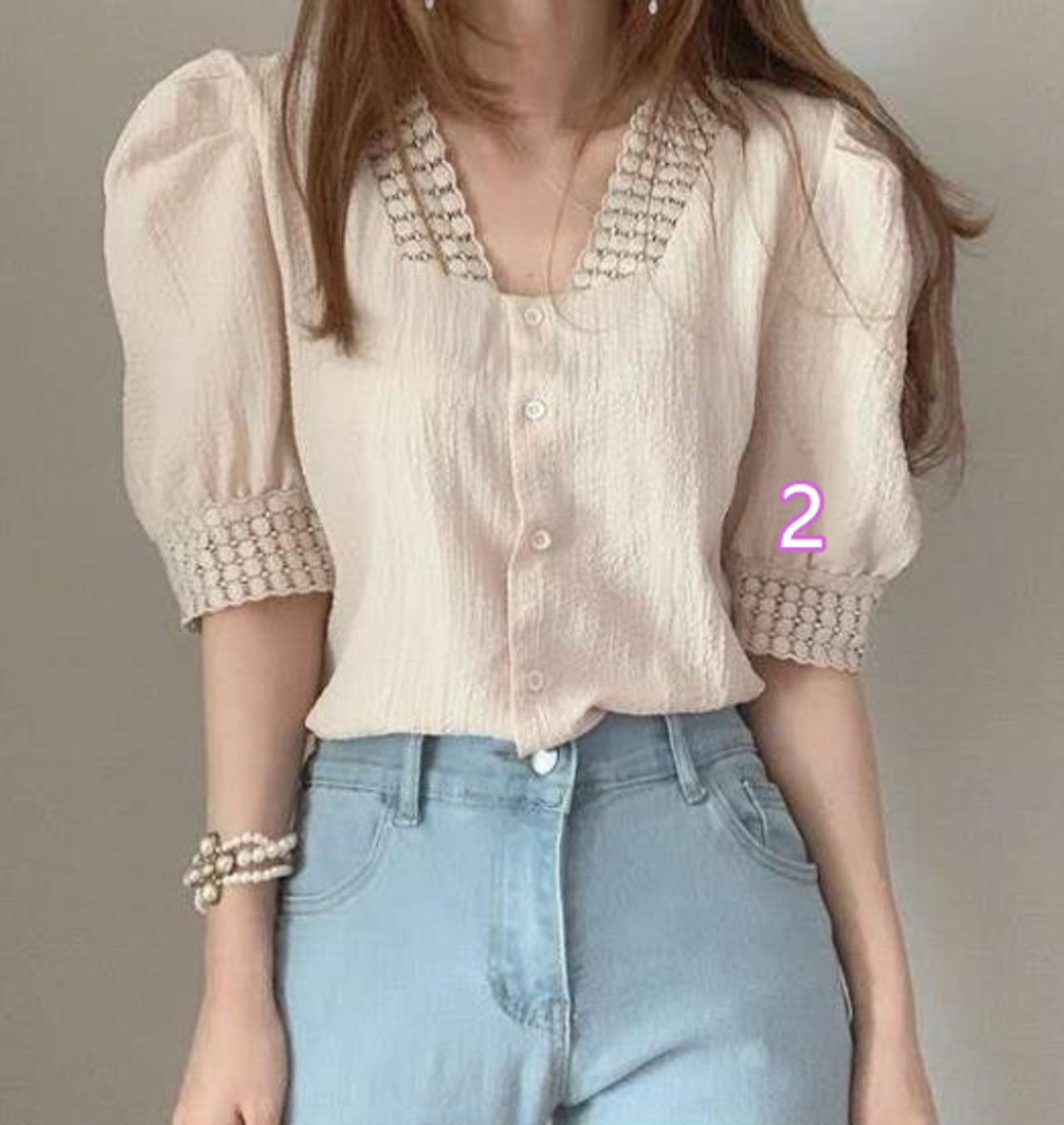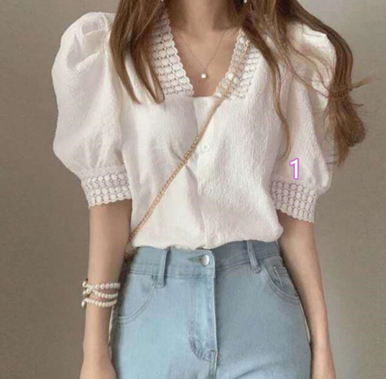 春夏新作 トップス 女 レディース 半袖 Vネック レース パフスリーブ シャツ ブラウス インナー