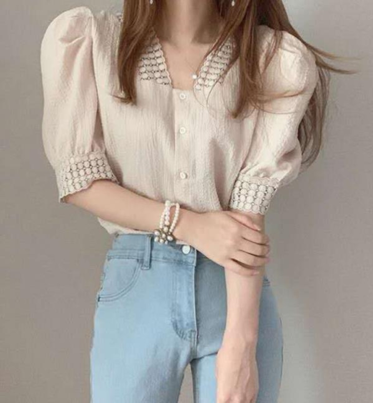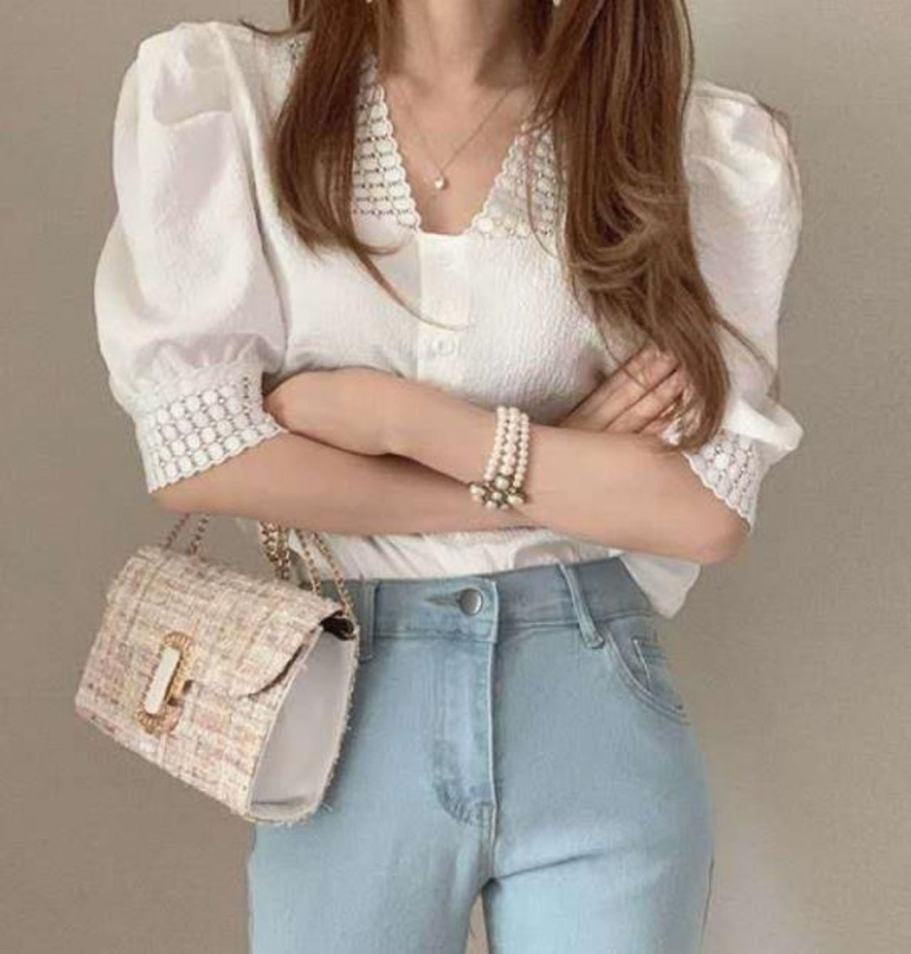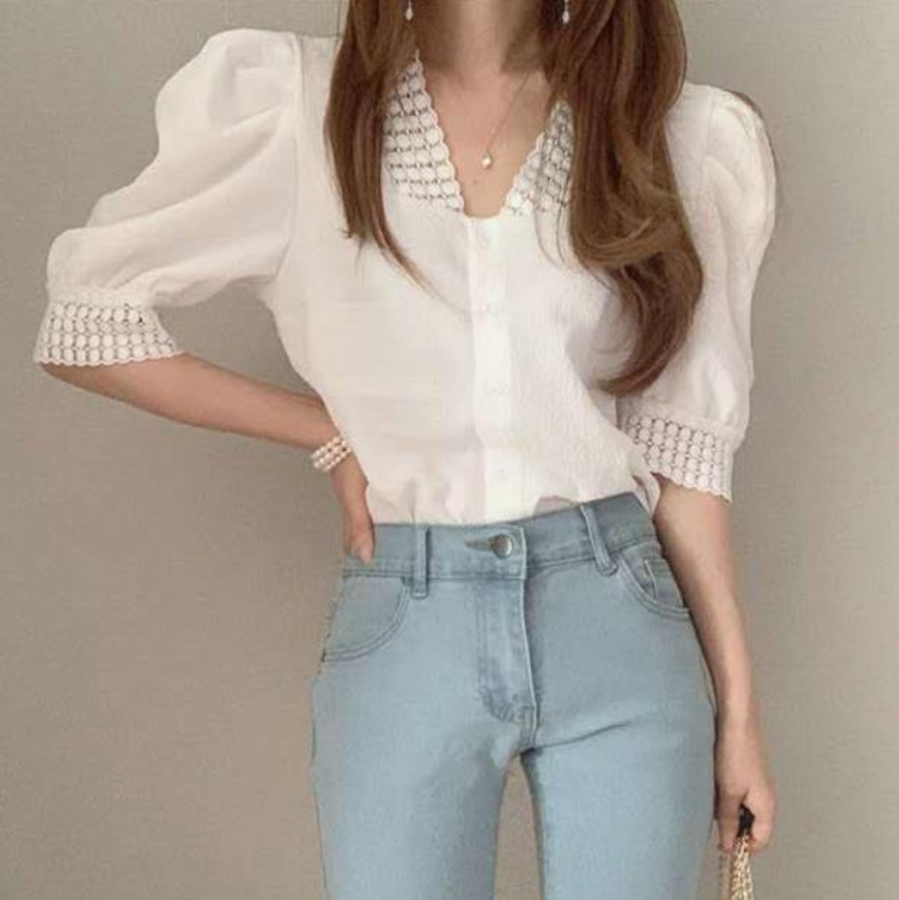 春夏新作 トップス 女 レディース 半袖 Vネック レース パフスリーブ シャツ ブラウス インナー