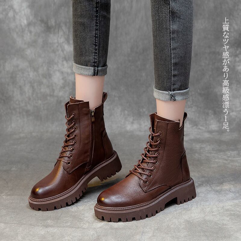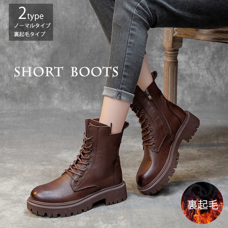 レディース 靴 ショートブーツ ミディミドル レースアップ 編み上げ 秋冬 厚底 裏起毛 黒 茶色